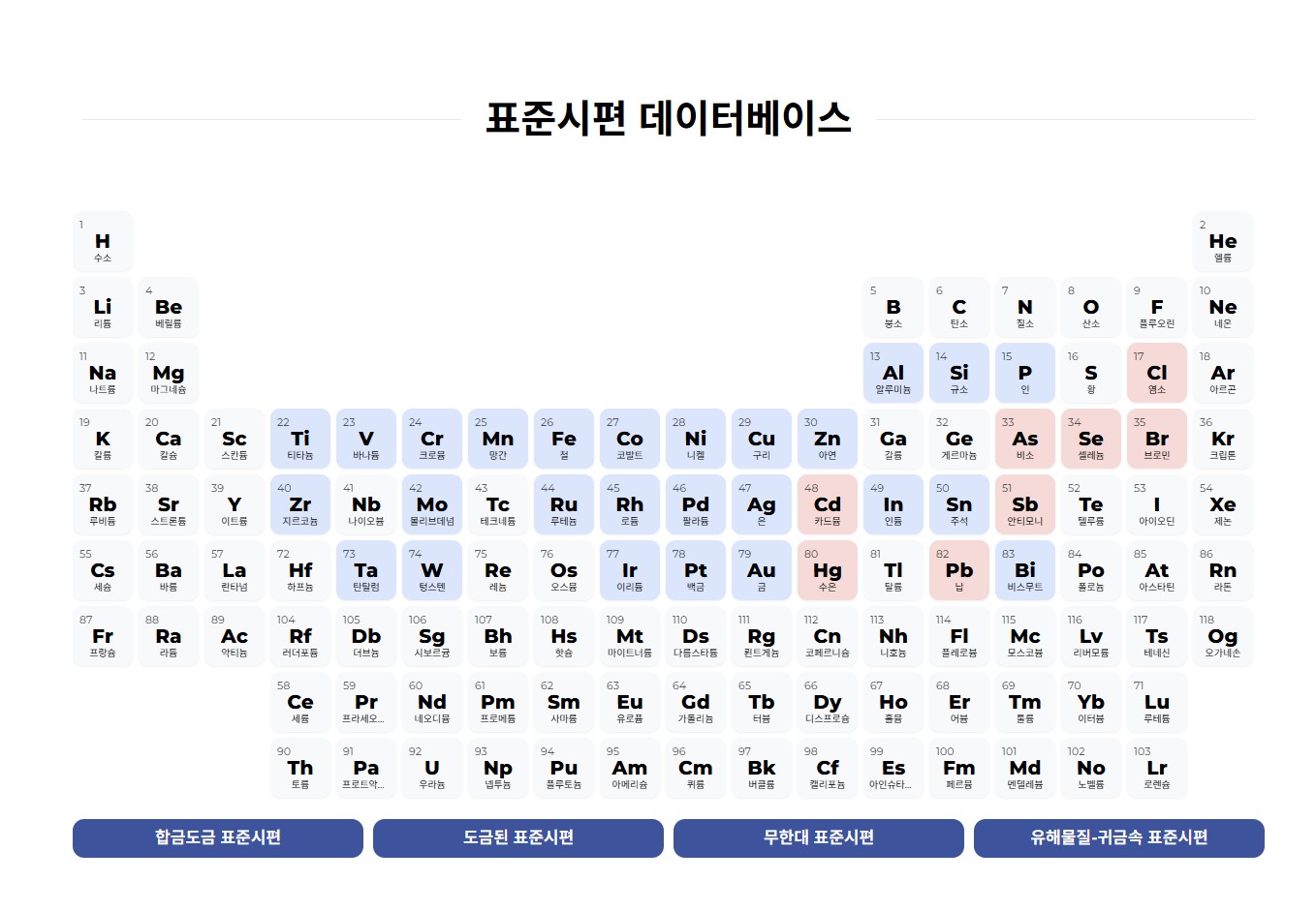 이제 사용자는 주요 원소(니켈, 구리, 아연 등)를 클릭하여 각 표준시편의 재질, 도금 두께, 형태 등의 세부 정보를 한눈에 확인하실 수 있습니다. 이는 국내 산업 현장에서 요구되는 정밀 측정 신뢰성 향상을 목표로 한 UG STANDARD의 기술력과 데이터 접근성 강화를 반영한 결과입니다.